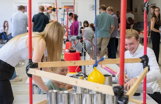 Untergebracht sind die neuen Azubis während des Starter Camps im Bildungszentrum DEULA in Rendsburg. Dort stehen Workshops zu Kommunikation, Konfliktbewältigung, IT, Rechnungswesen sowie Lern- und Zeitmanagement auf dem Programm. Die Seminare sind praxisnah, interaktiv und weit entfernt vom klassischen Frontalunterricht – Bausteine eines modernen Onboardings, das Orientierung und Sicherheit gibt. Und immer wieder geht es ums Teambuilding, etwa bei dem Spiel „Impulsreaktion“. In Gruppen bauten die Azubis Abschnitte einer riesigen Kettenreaktion auf – mit Mausefallen, Luftballons, Holzstücken und Spielzeugautos. Eine spielerische Lektion in Sachen Zusammenarbeit: lachen, tüfteln, scheitern, nochmal probieren – bis die Kette endlich reibungslos funktioniert.